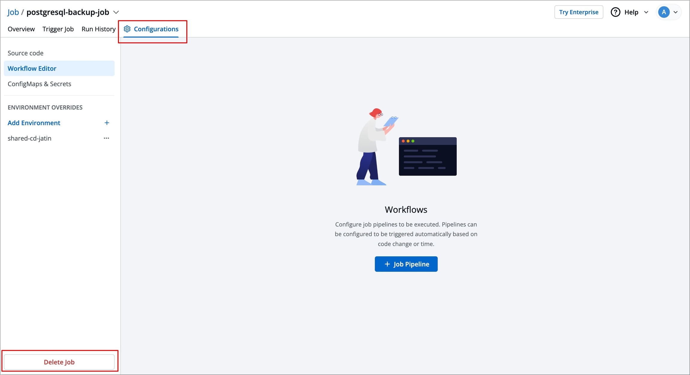 Figure 8: Confirming Delete Job Pipeline After deleting any configured pipelines in a job workflow, select Delete Job to delete the job.