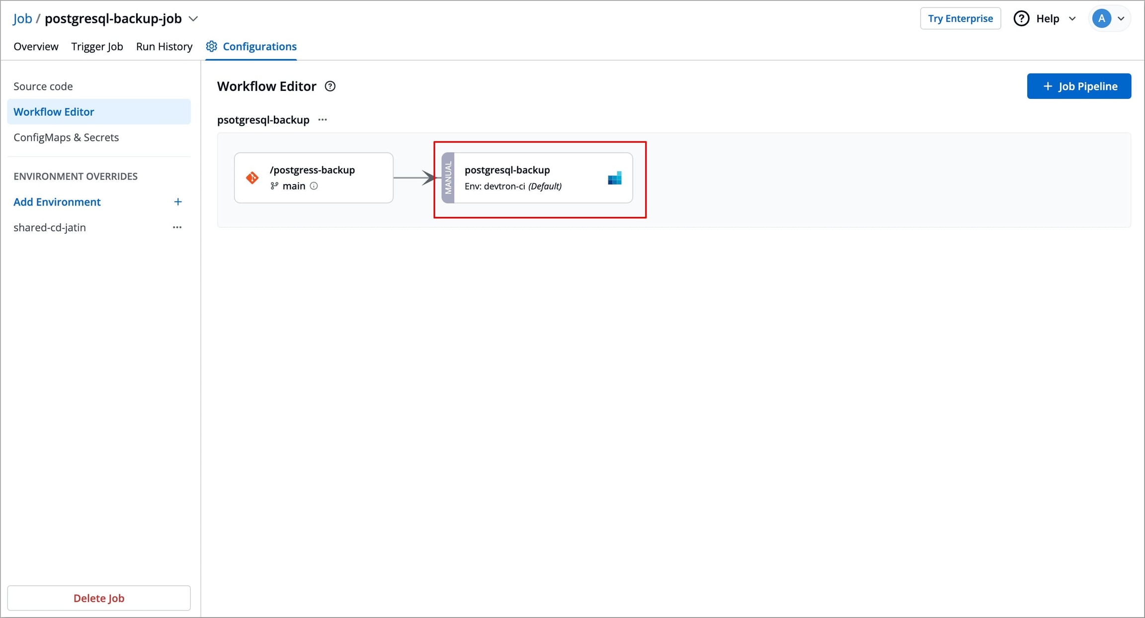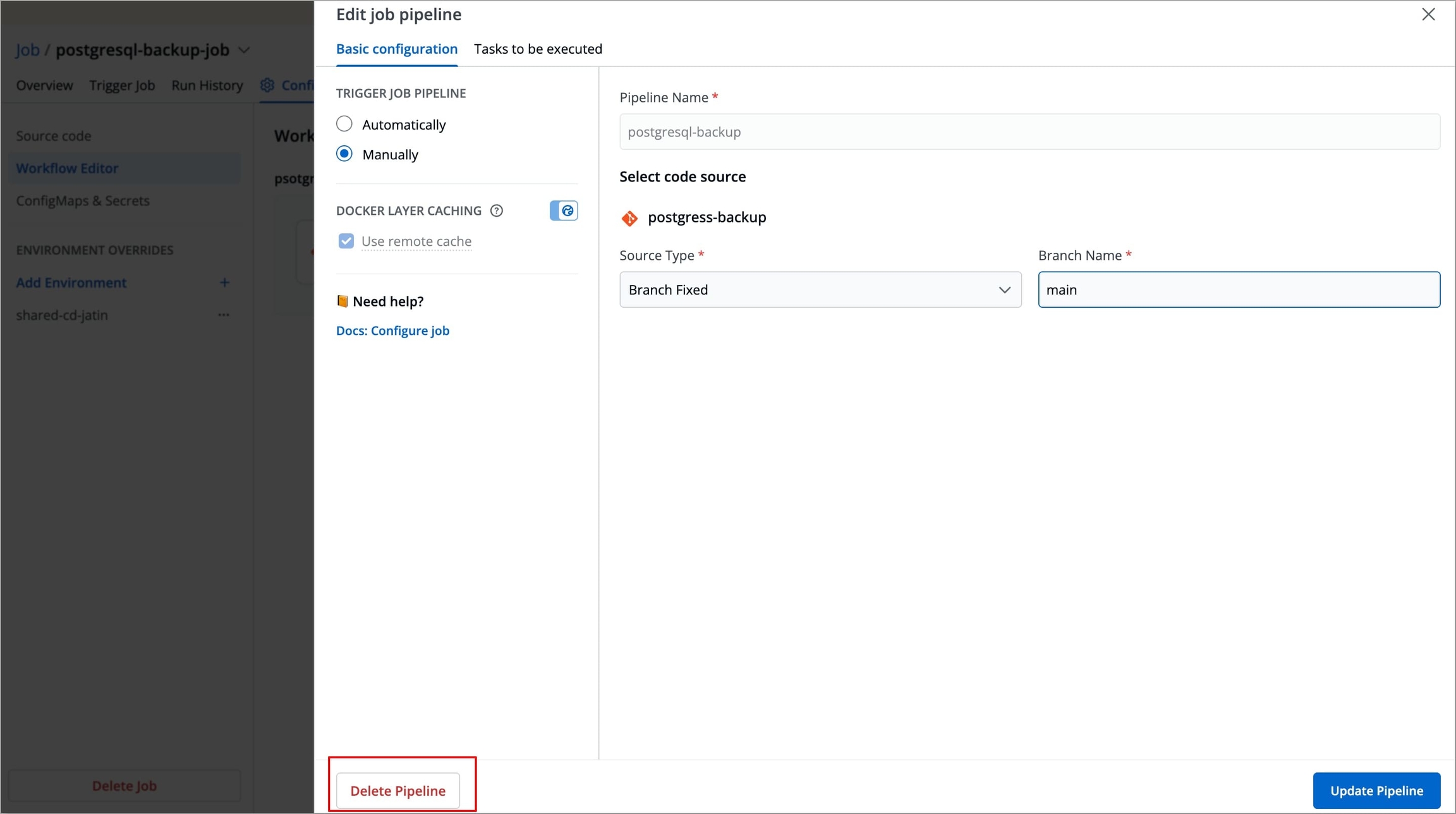 Figure 6: Selecting Job Pipeline Select Delete Pipeline at the bottom left corner of the edit job pipeline modal window to delete the job pipeline.