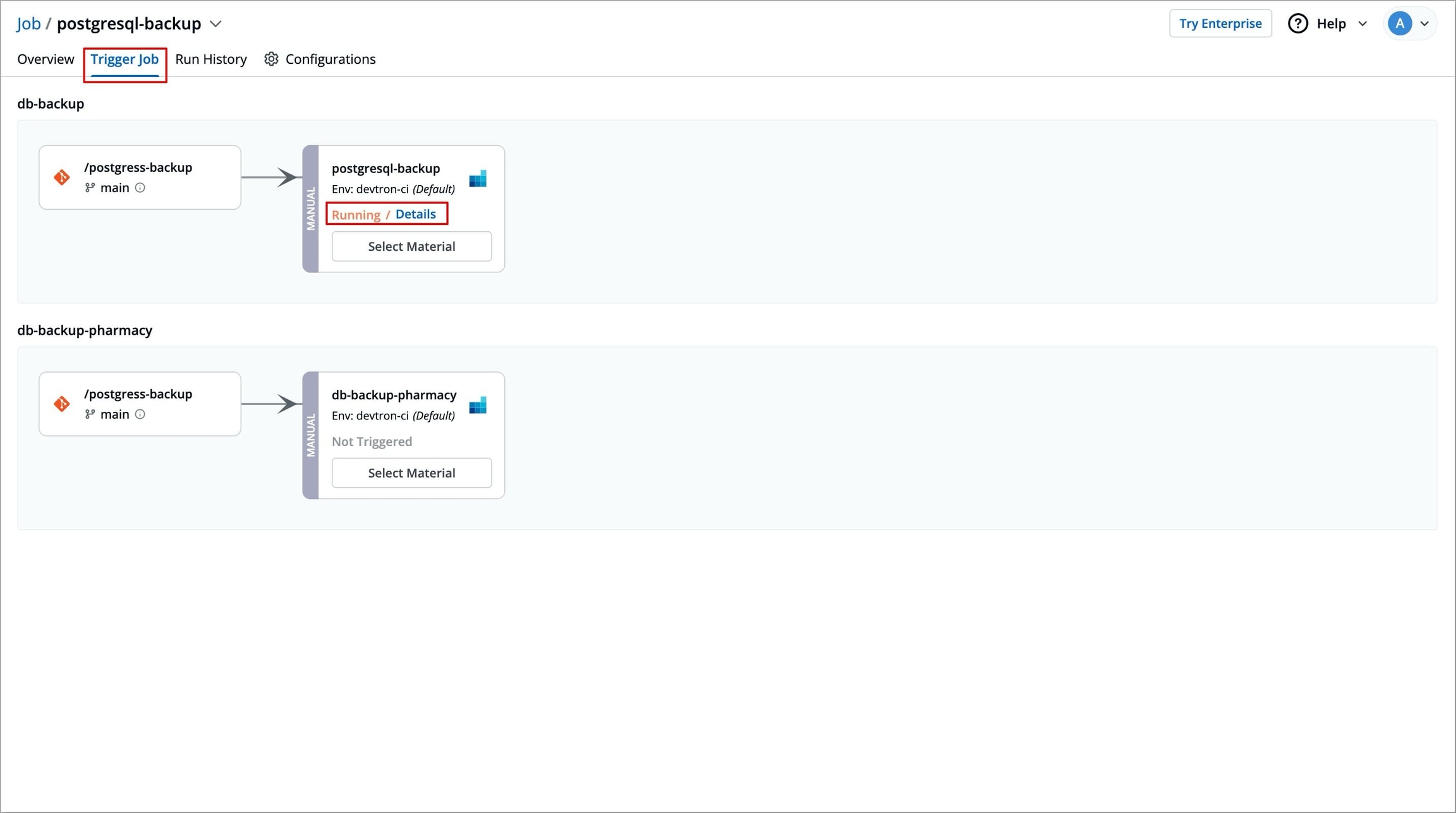 Figure 1: Triggering job Click Select Material for the job pipeline you wish to execute. A modal window will open, under the Code-source tab, this window lists all recent commits along with their hash, author, date, and message from your configured source repository.