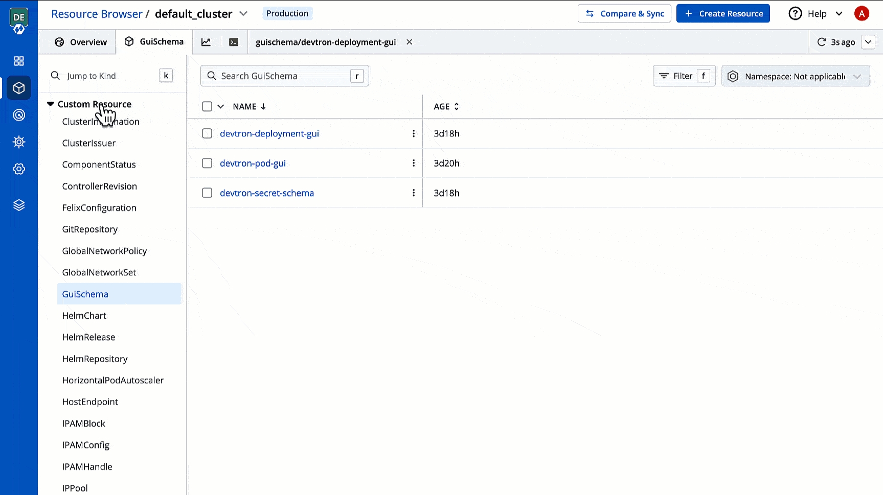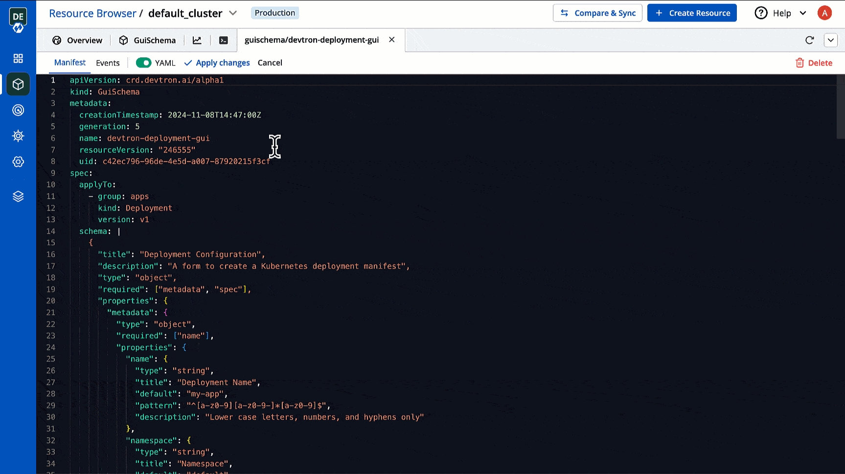 In Devtron, you can create CRDs for defining the GUI schema. Your GUI schema will be used to determine the fields displayed to the user when they edit the manifest in GUI mode.