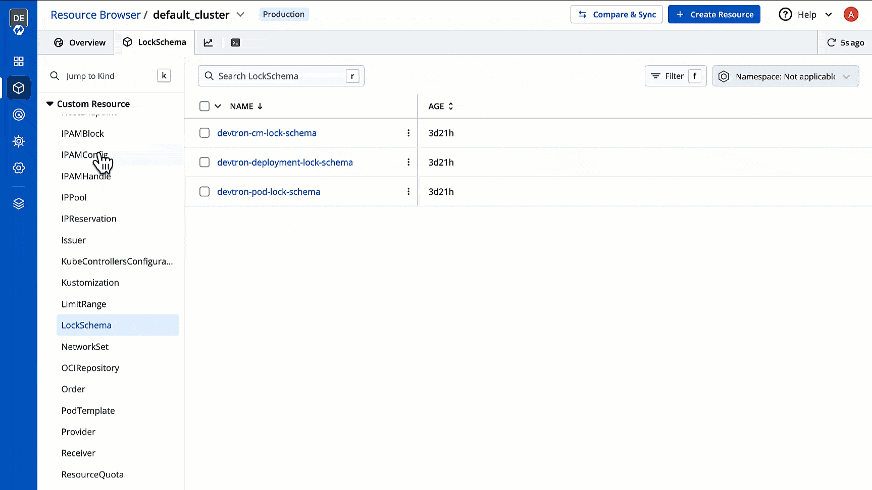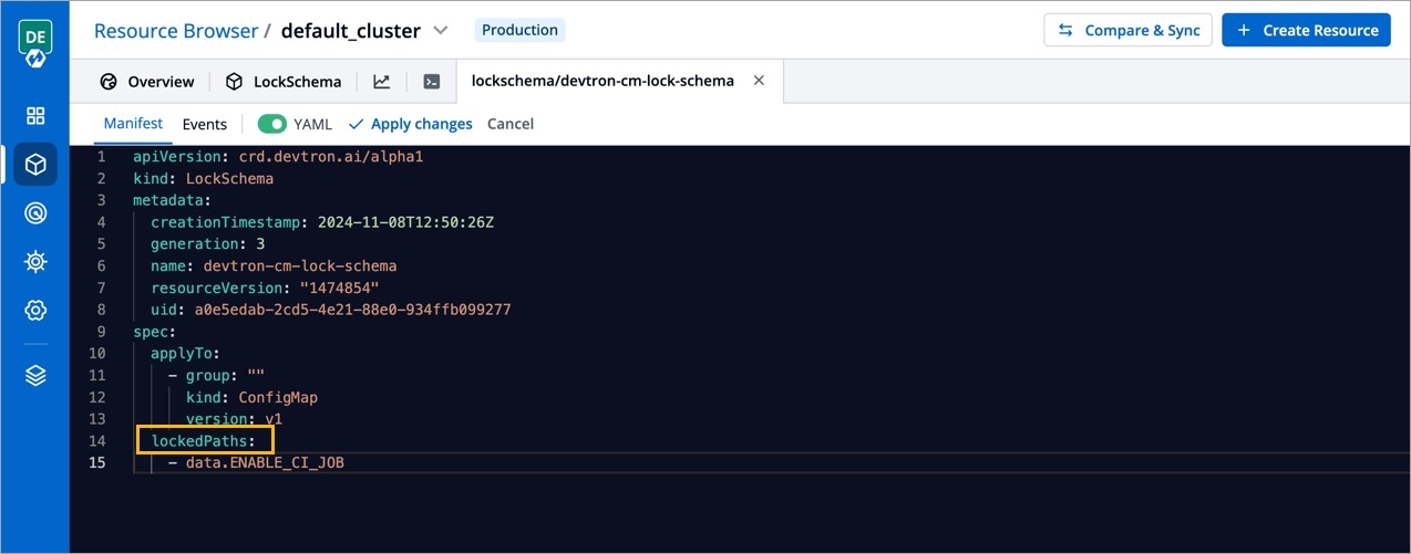 In Devtron, you can create CRDs for defining lock schema. Your lock schema will be used to determine the fields (in the resource manifest) that cannot be added/updated/deleted by non-superadmins. This is especially useful for preventing unwanted edits to the manifests of pod, deployment, configmap, and many more.