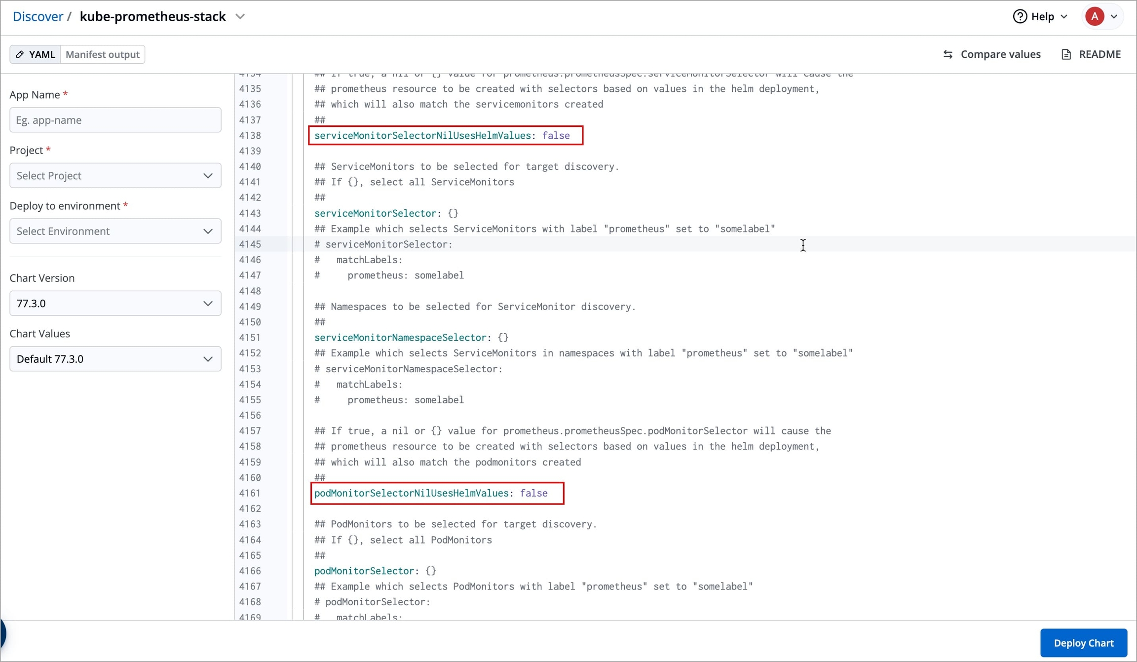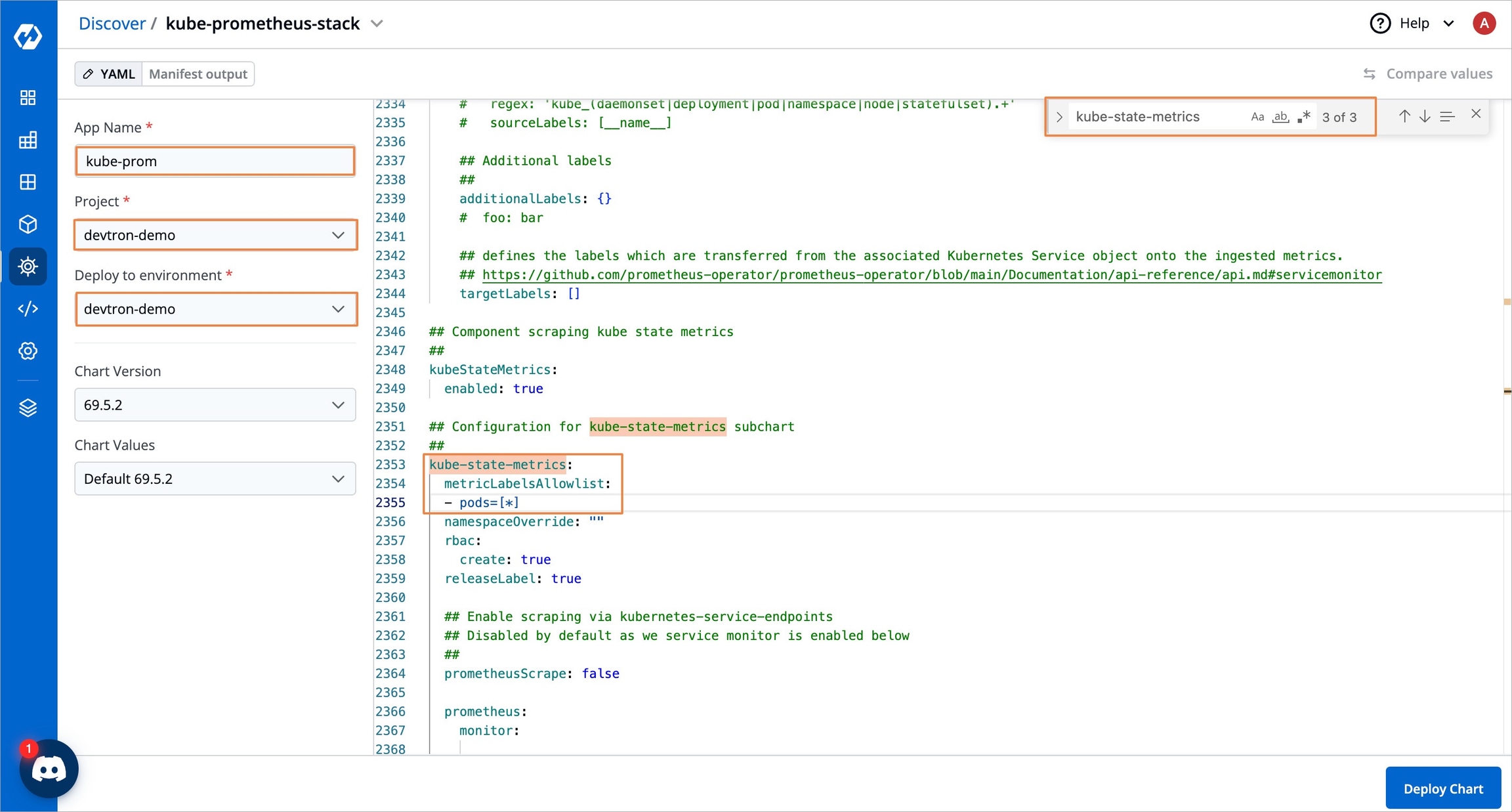 kube-state-metrics: metricLabelsAllowlist: - pods=[*]serviceMonitorSelectorNilUsesHelmValues: false podMonitorSelectorNilUsesHelmValues: falseSearch for the above parameters, and update them as shown (or customize as needed).