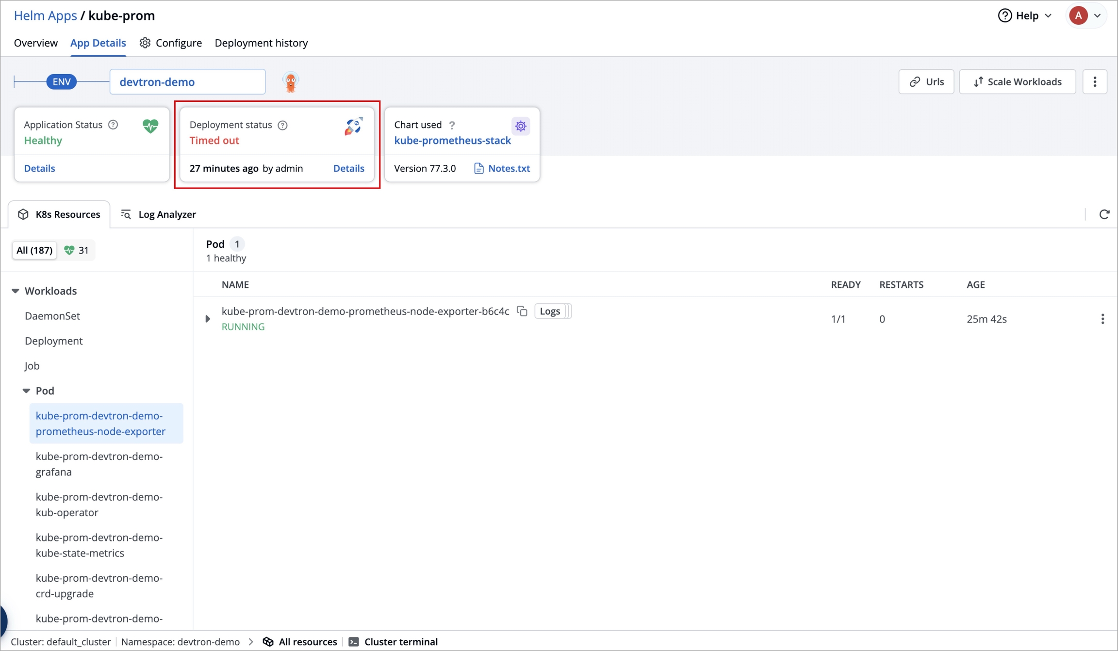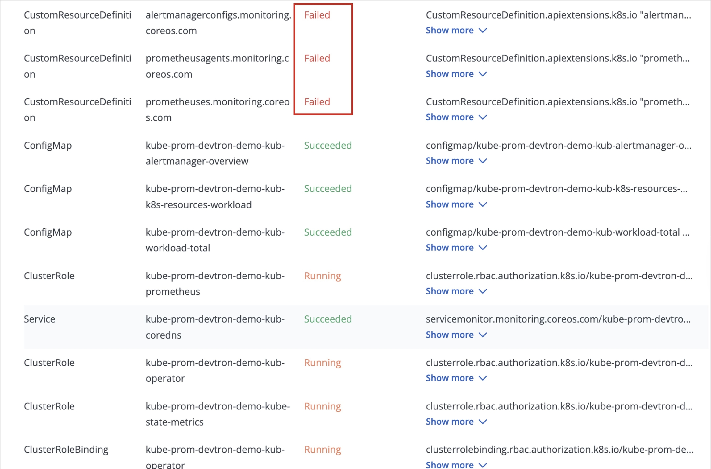 While deploying kube-prometheus-stack chart, the deployment status may show as Timed out, and some CustomResourceDefinitions (CRDs) may appear as Failed.