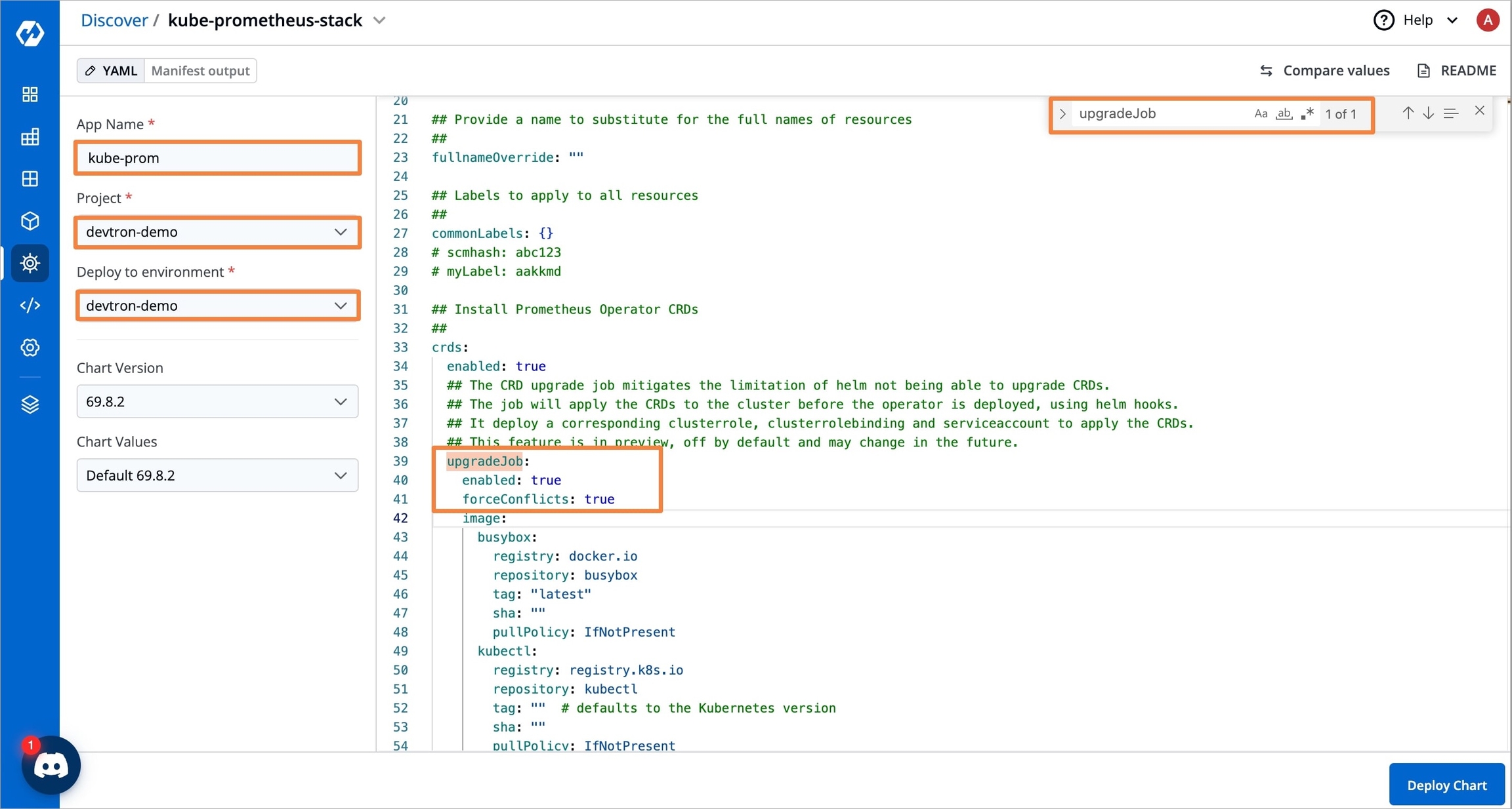upgradeJobparameter in the Helm chart to ensure CRDs are applied before deploying Prometheus.In the Prometheus Helm chart settings, locate the