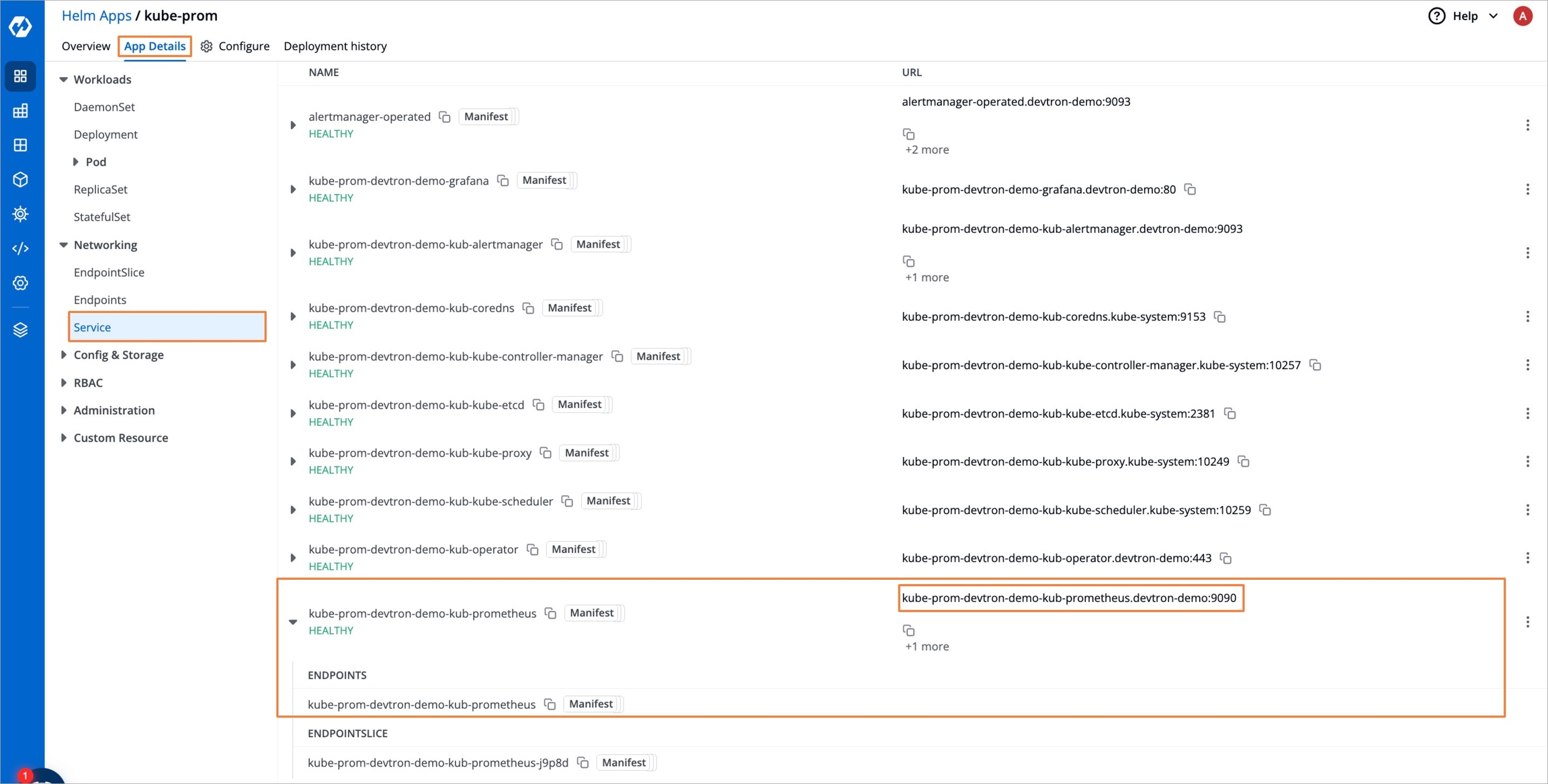 Once Prometheus is installed, go to its App Details and navigate to Networking → Service in the K8s resources. Expand the Prometheus server service to see the endpoints.