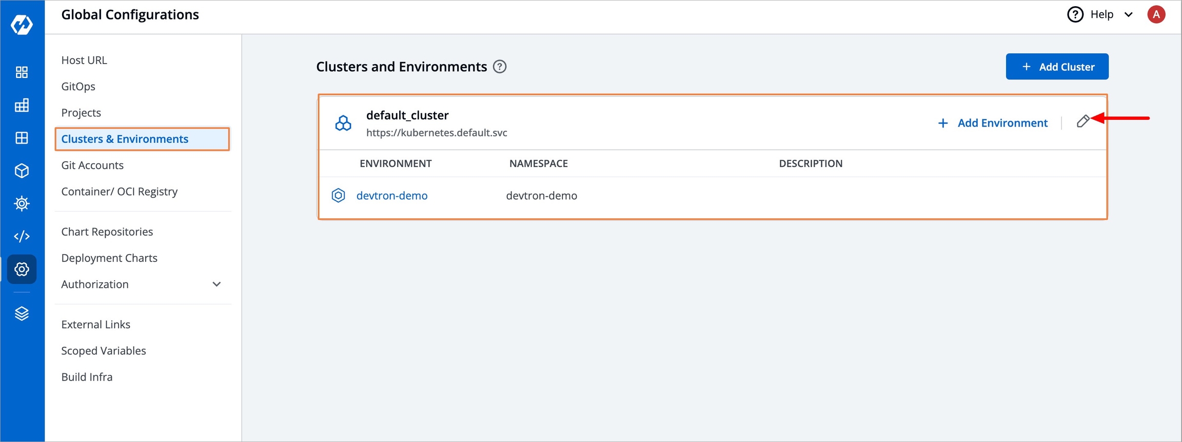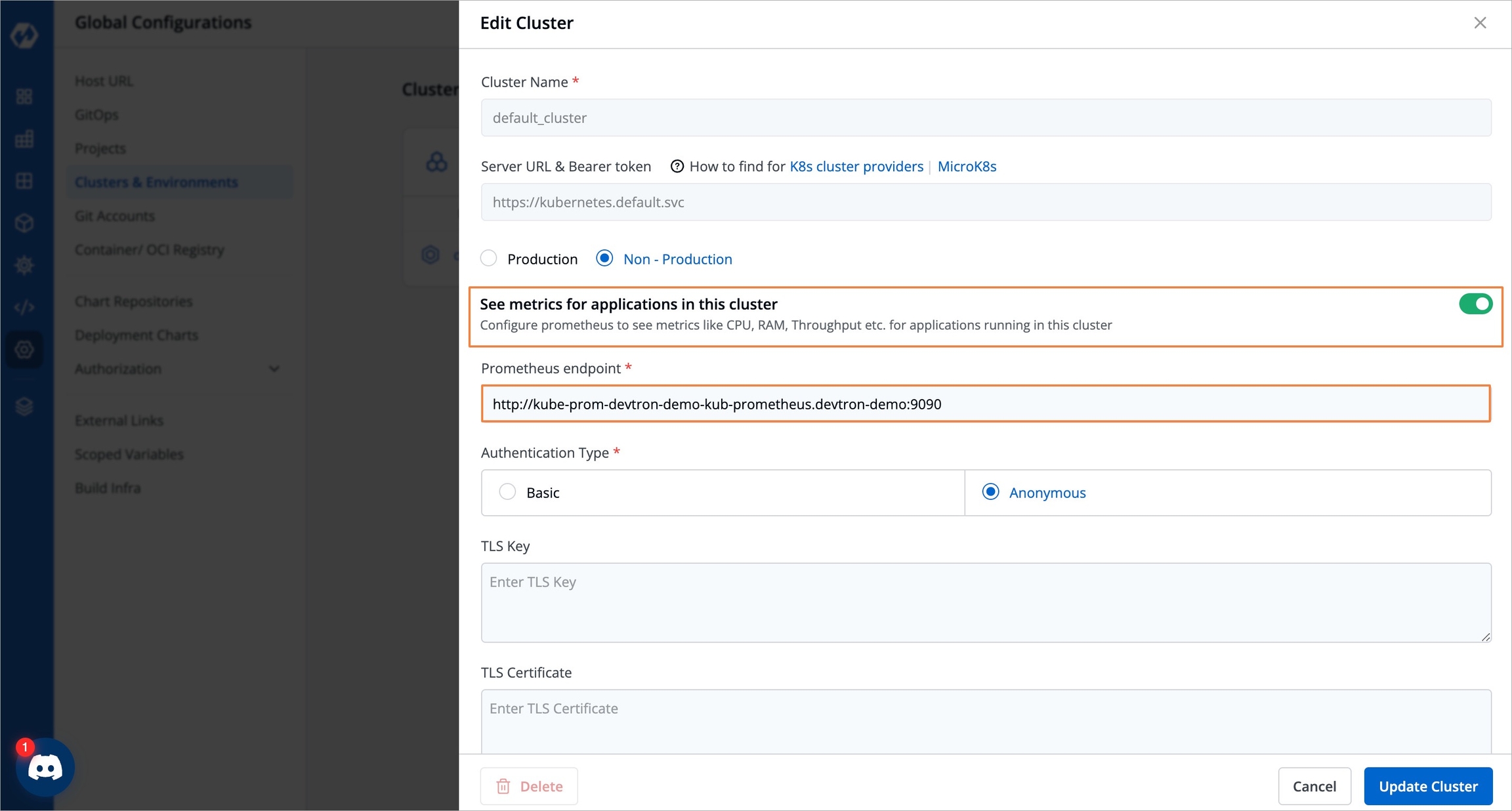 Figure 6: Clusters and Environments Now to set up the Prometheus endpoint: