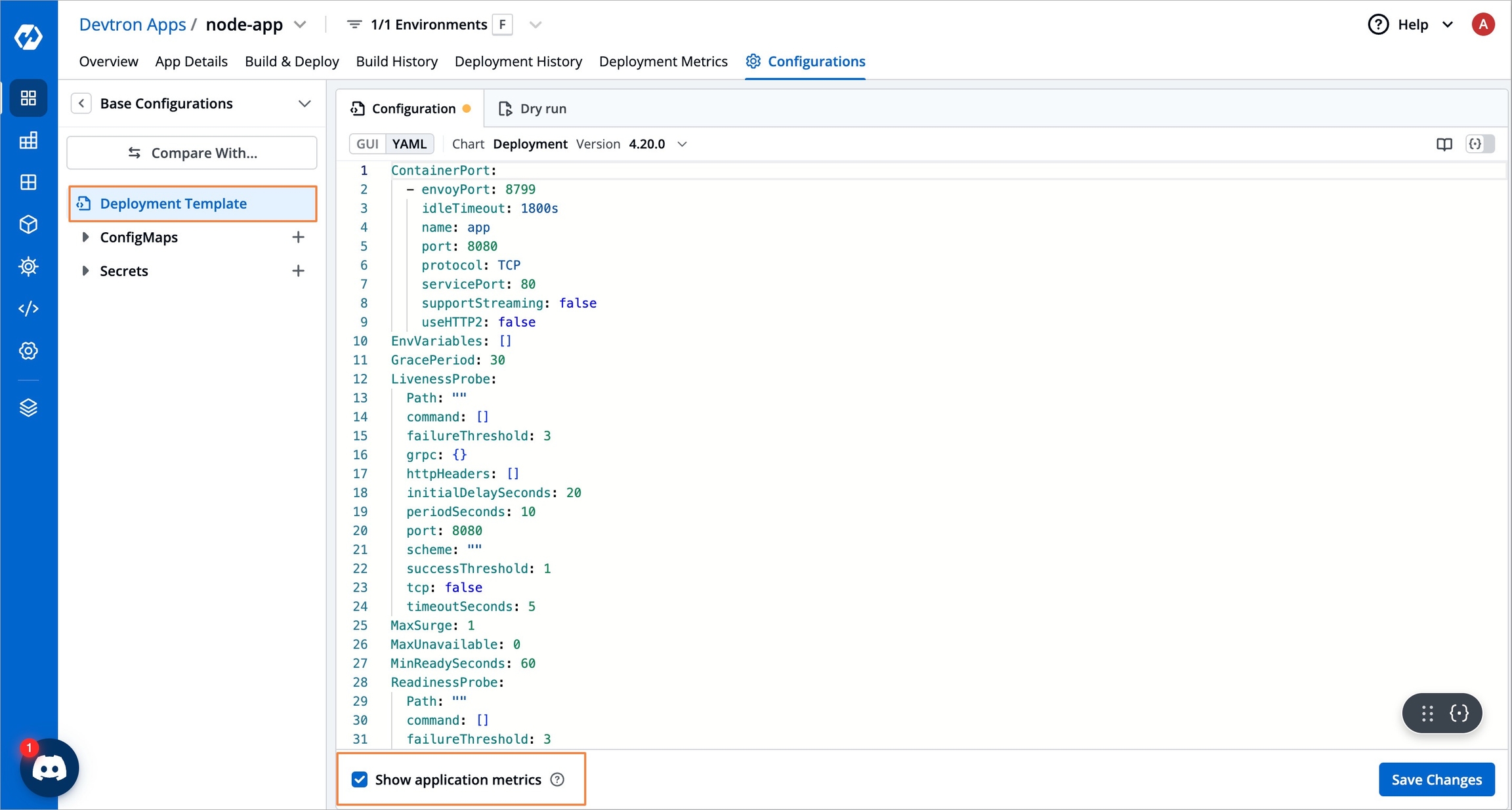 Enable Application Metrics in the Deployment Template as shown below and save the changes.