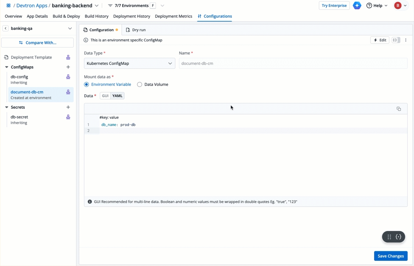 The process to override both ConfigMaps and Secrets is similar to Override Deployment Template. Refer the tutorials below to know the process in YAML mode. In case you wish to use GUI mode, skip to Overriding in GUI mode.