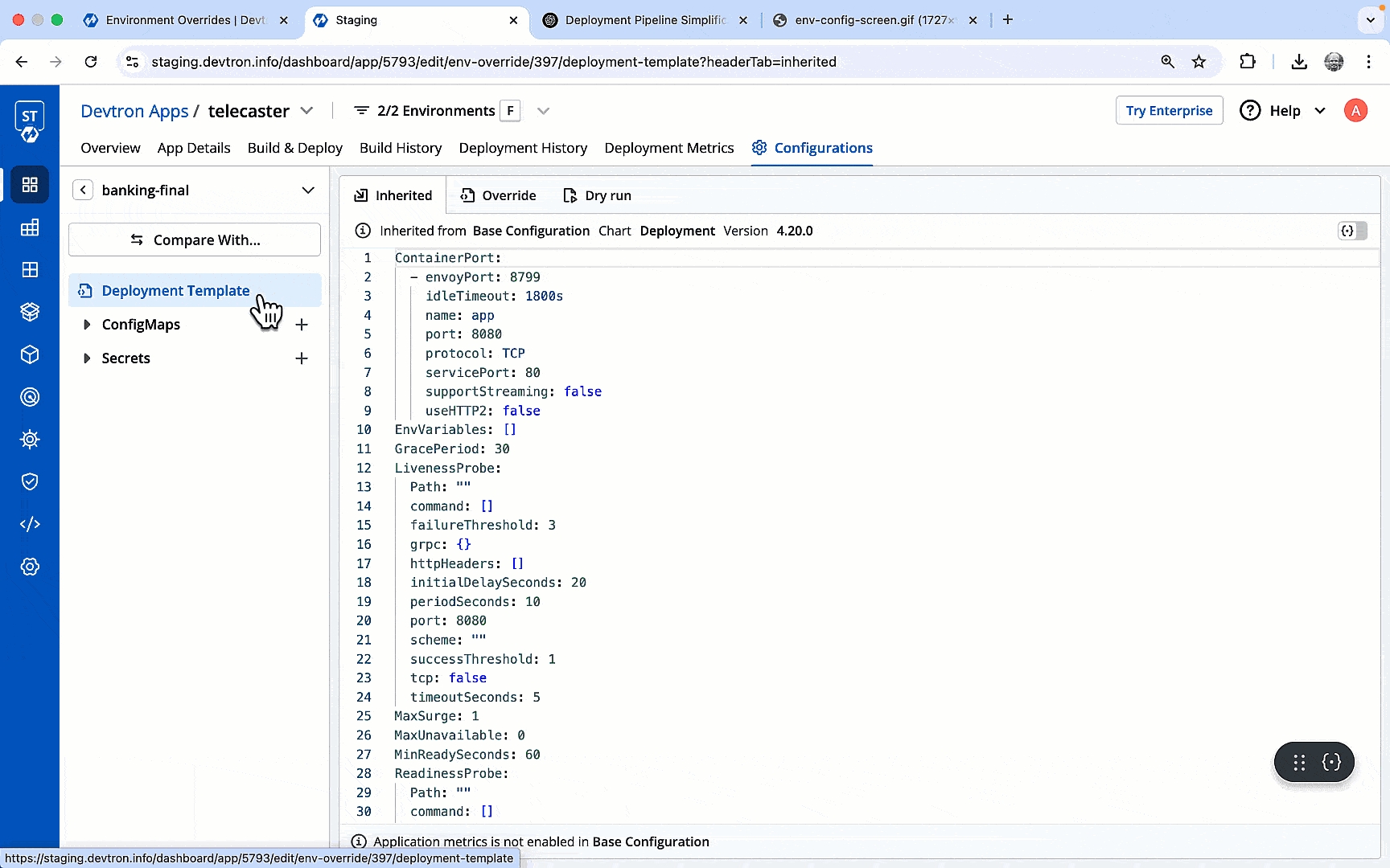 When you add a deployment pipeline to an application's workflow, each environment configuration initially inherits the Deployment Template, ConfigMap and Secret from the Base Configurations of the application.