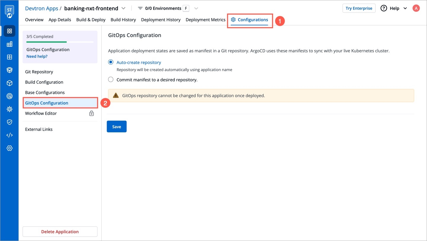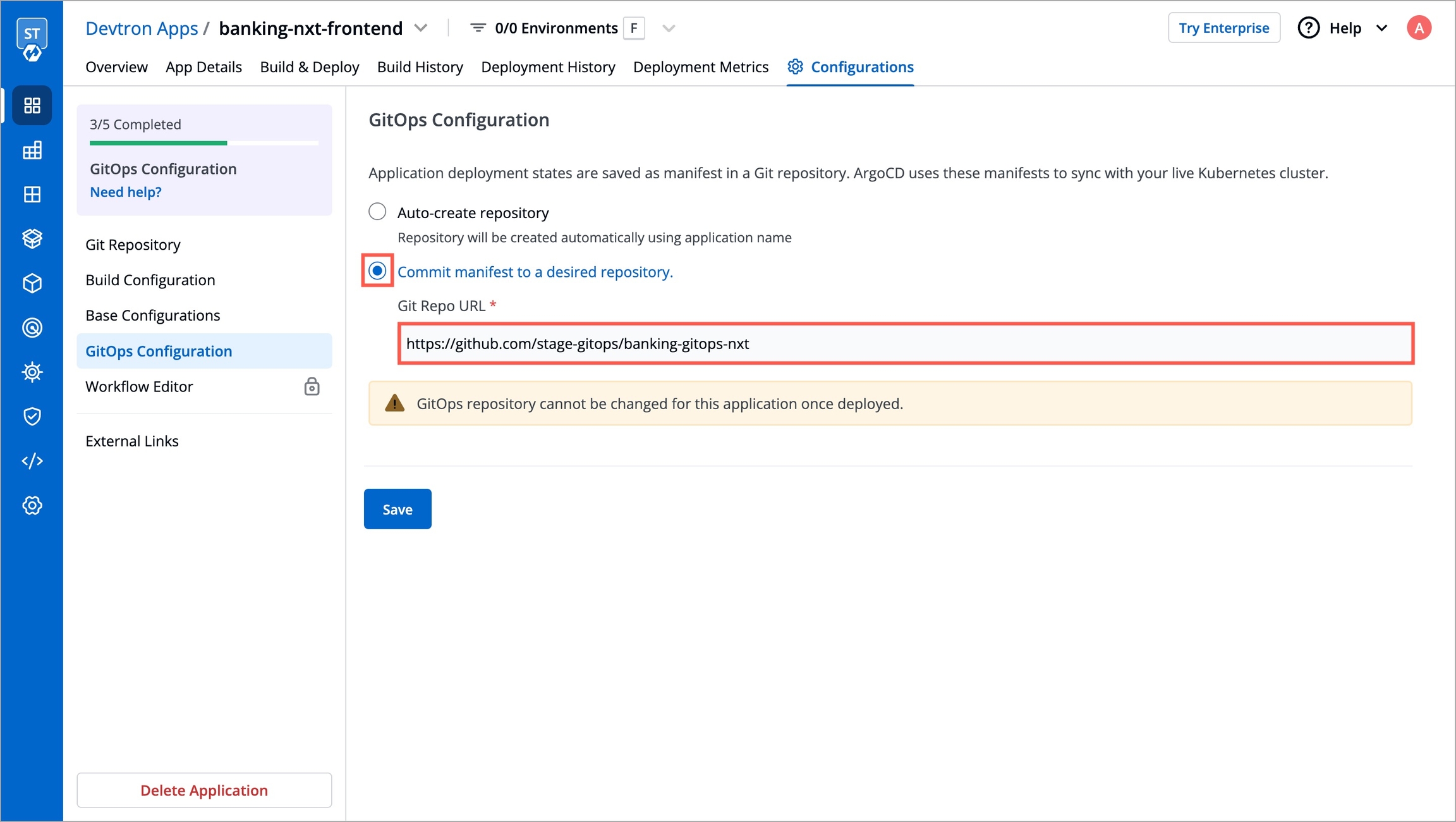 Go to Applications → Devtron Apps (tab) → (choose your app) → App Configuration (tab) → GitOps Configuration.