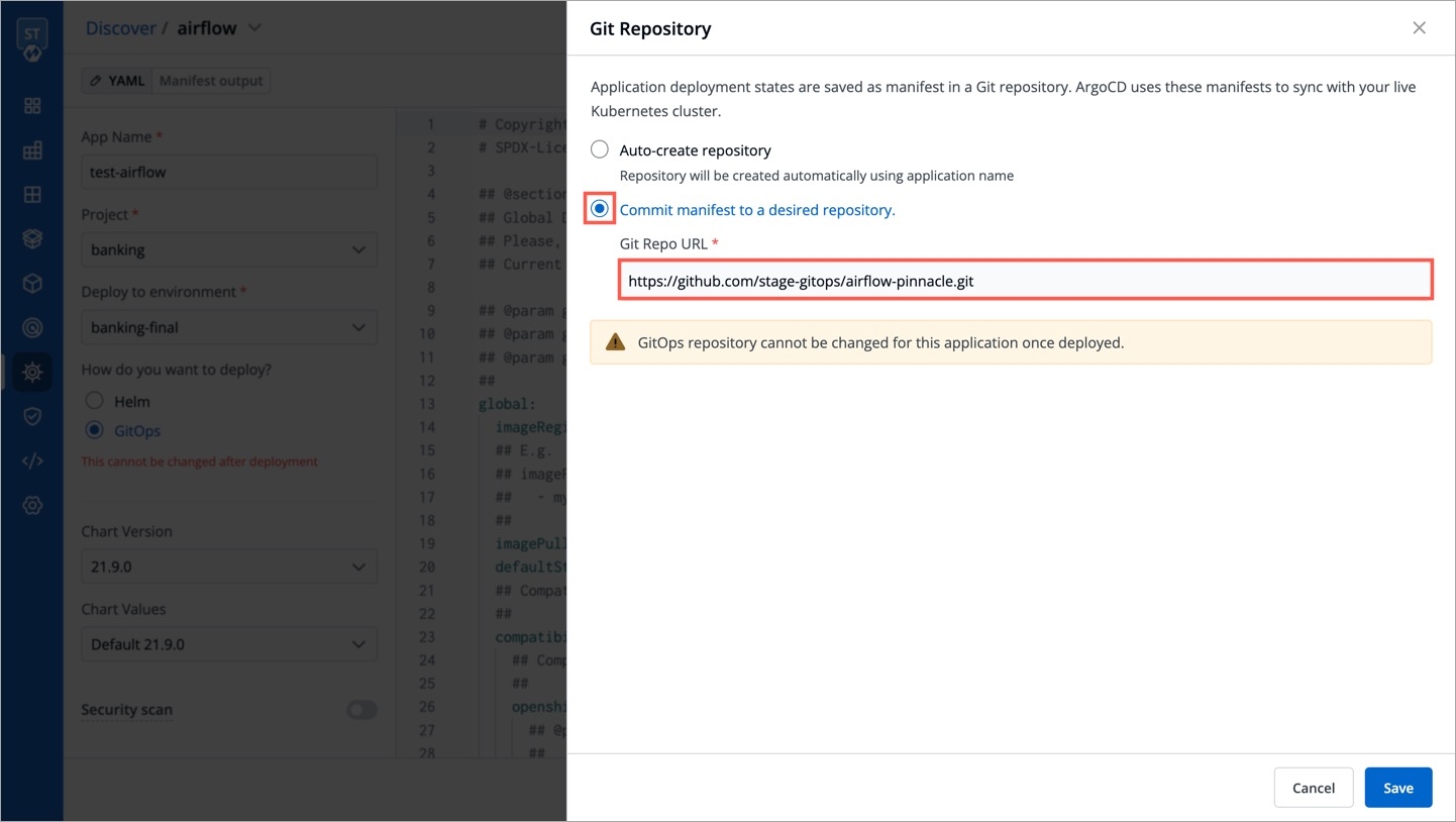 Commit manifests to a desired repository - Select this option if you wish to add a custom repo that is already created with your Git provider. Enter its link in the