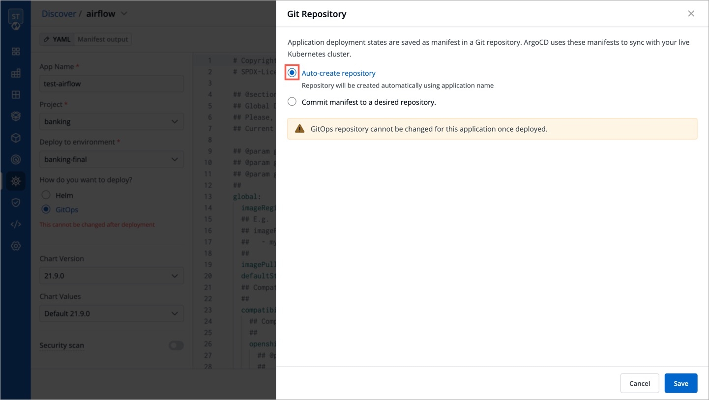 App Name,Project, andEnvironment; an option to choose the deployment approach (i.e., Helm or GitOps) would appear.