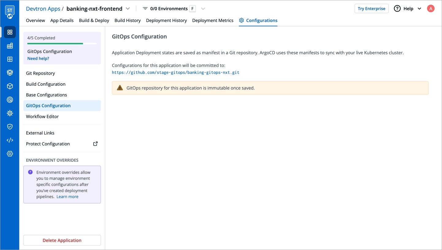 GitOps repositories, whether auto-created by Devtron or added manually, are immutable. This means they cannot be modified after creation. The same is true if you have an existing CD pipeline that uses/used GitOps for deployment.