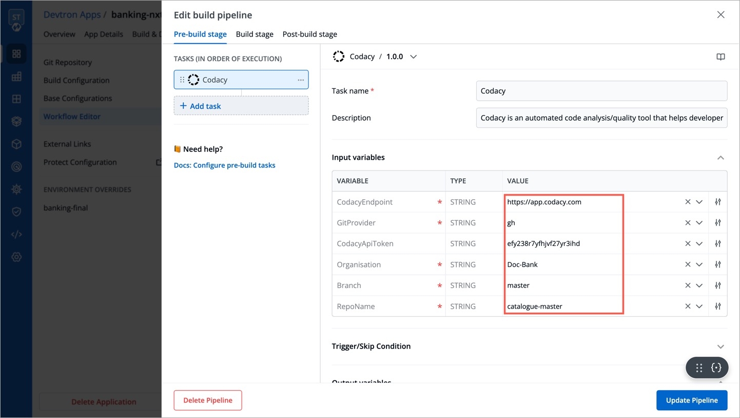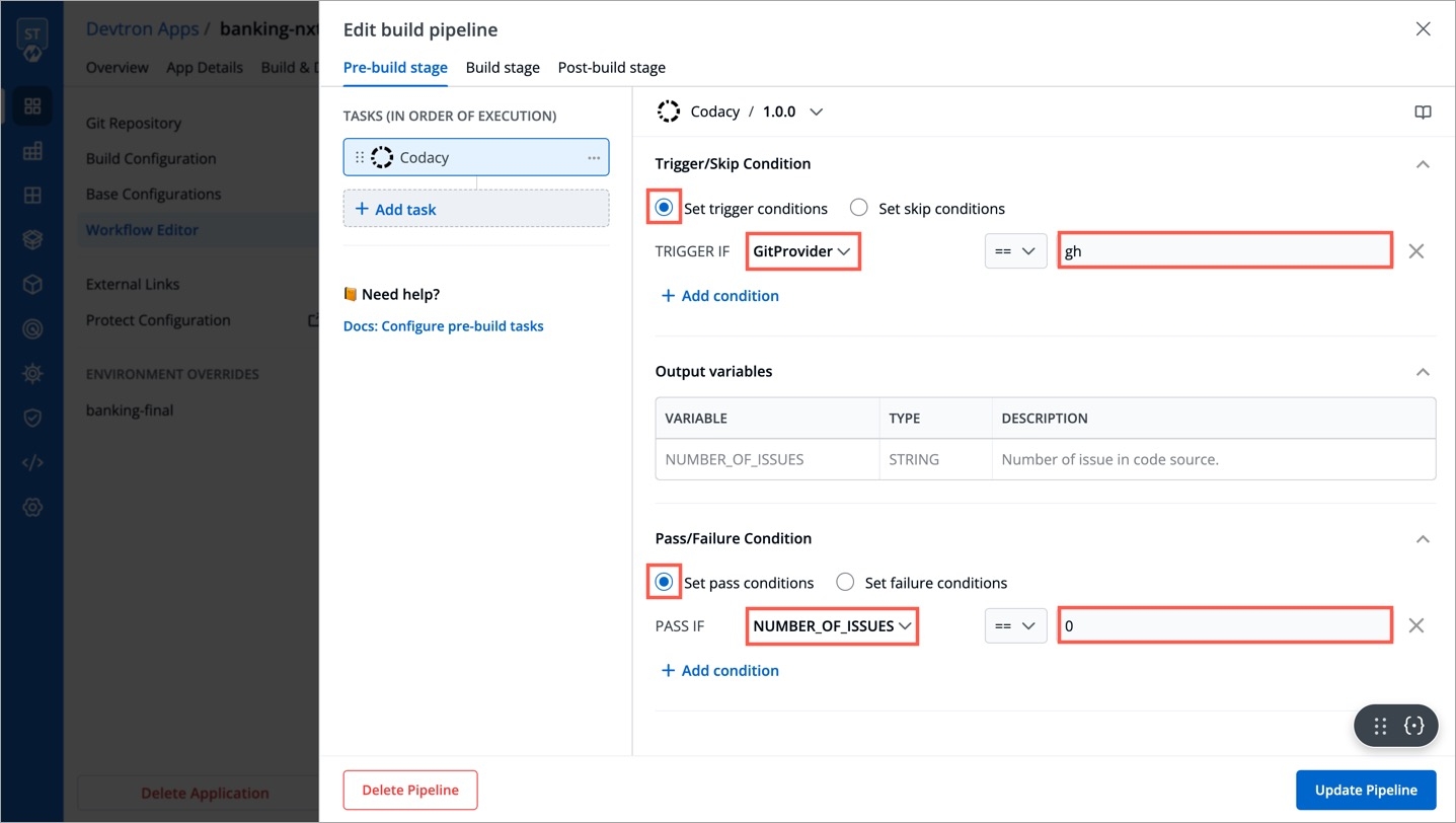 Trigger/Skip Condition, set the trigger conditions to execute a task orSet skip conditions. As an example: CodacyEndpoint equal to https://app.codacy.com.Note: You can set more than one condition.In